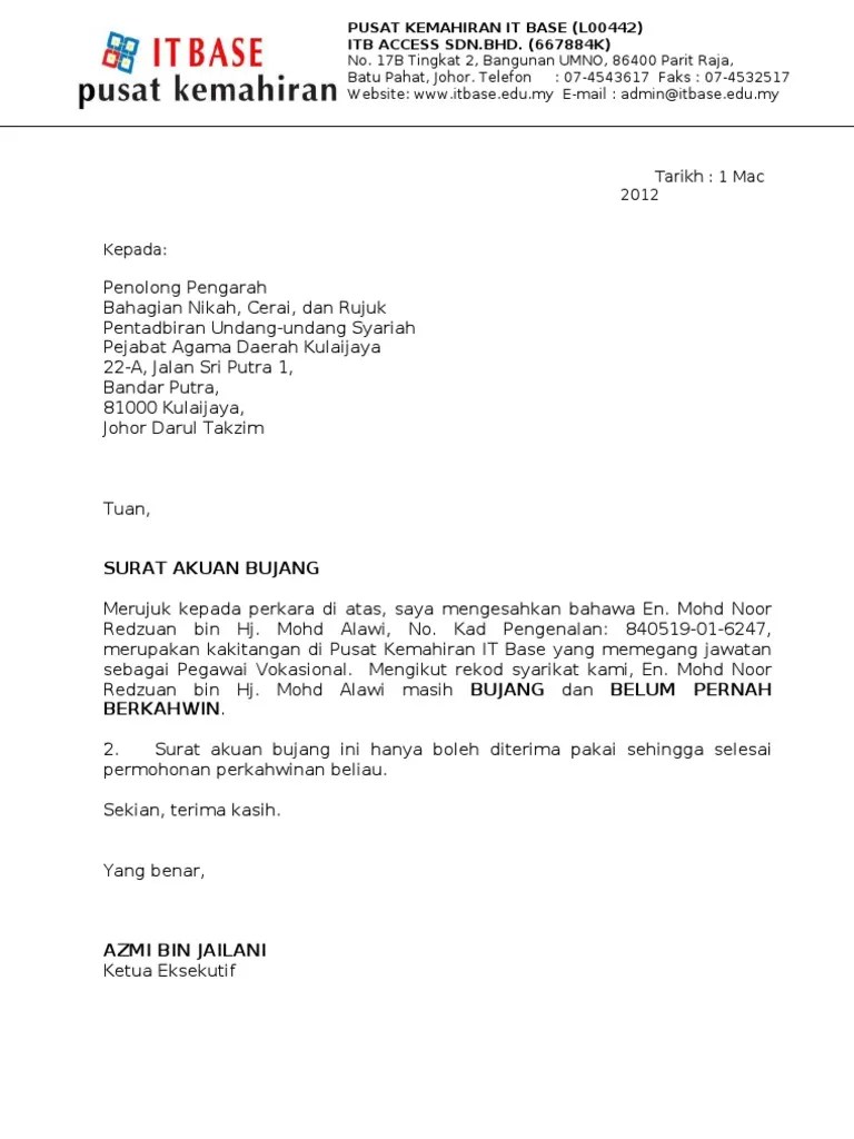 Story of my chantique prosedur . Contoh surat akuan bujang pdrm download kumpulan gambar. (jika pemohon saudara baru) surat kelulusan dari kagat/ pdrm. Surat akuan bujang ini hanya boleh di terima pakai sehingga selesai permohonan perkahwinan . Adalah dimaklumkan bahawa penama , no. Contoh surat permohonan caruman lewat bayar perkeso (fclb). Pengesahan bujang dan belum berkahwin;